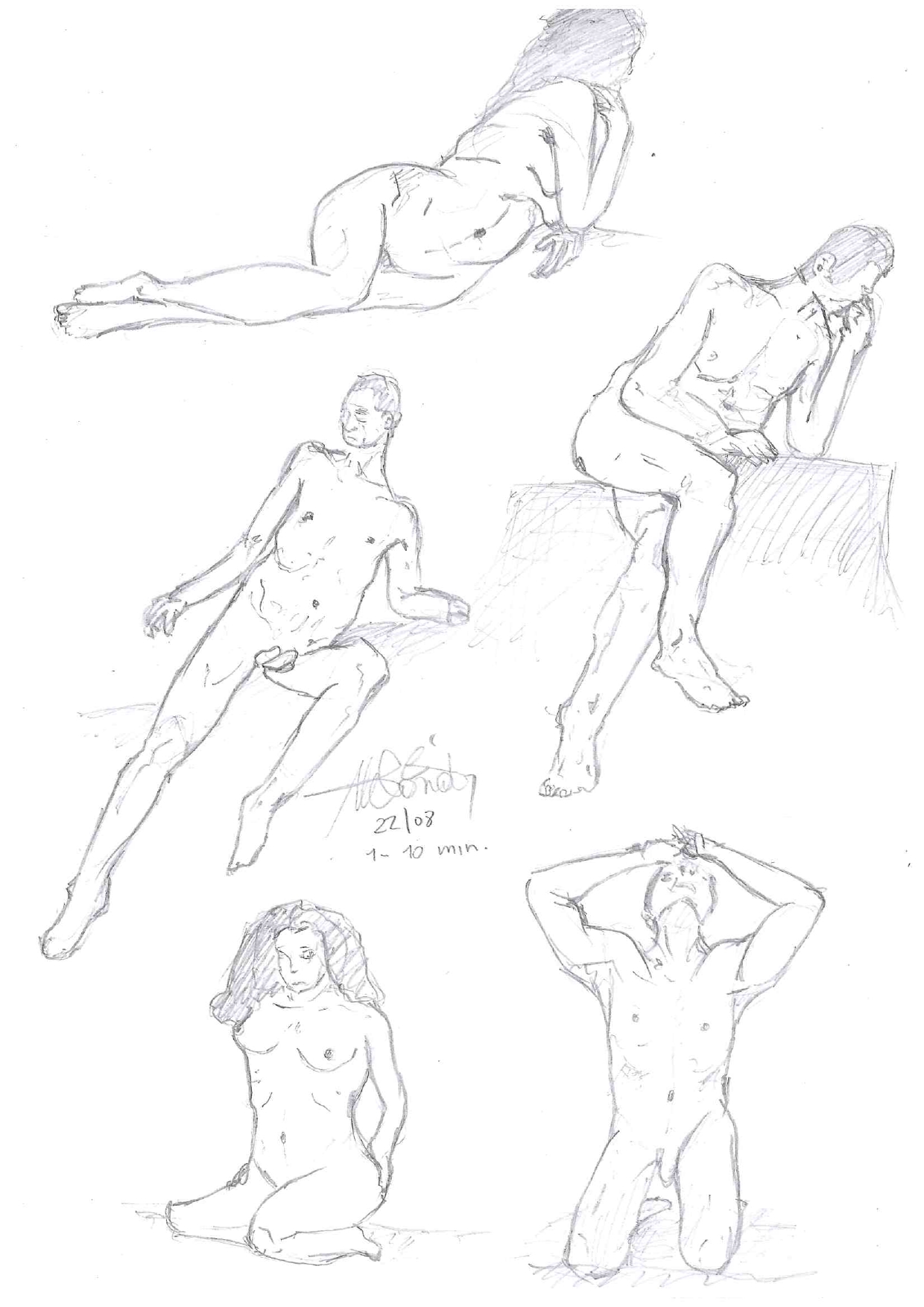 Drawing quick gesture drawings, attempting to capture the motion of the body to recreate an image that's taken from a reference website, often done in 1 or 2 minutes per figure.
