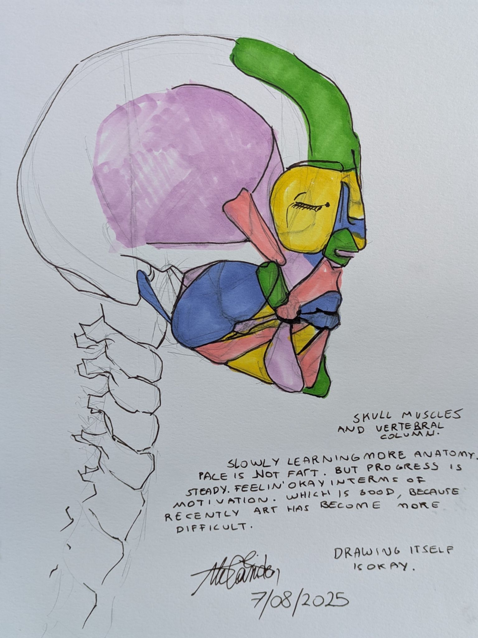 Studying anatomy via a digital book, drawing from references granted in the book, often drawing literally from the book. To better understand the shapes necessary to draw humans.Â